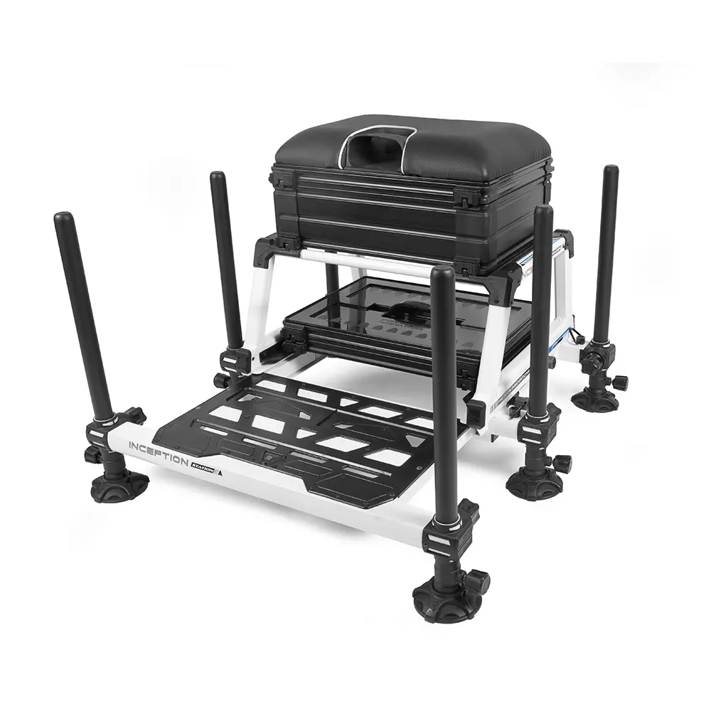 StationThe new Inception Station seatbox builds on the success of other Inception seatboxes and features many of the same features, such as Mag-Lok clips, footrest locking pistons and soft-touch cranks.Built on a super-strong and stylish frame, available in white or graphite, the Inception Station seatbox offers an abundance of storage space. The deep side drawer with compartments is perfect for accessories, while the deep side drawer with removable dividers can be used for hook length boxes, pole reels or any larger accessories. The cassette under the frame includes a 26mm tray and lid where additional units can be added if needed. The box comes with 6 telescopic legs, which allows for effortless fine adjustments to the bank. Comes with: padded seat, 2 Mag-Lok drawers, 26mm shallow tray on runners, lid, 6 x 30mm telescopic legs, 50cm, base plate with locking pins, deluxe padded shoulder strap.